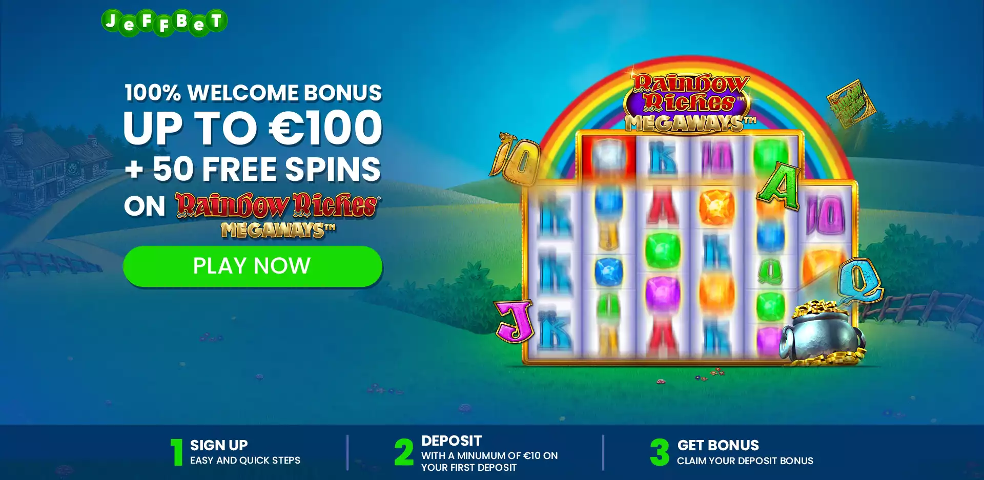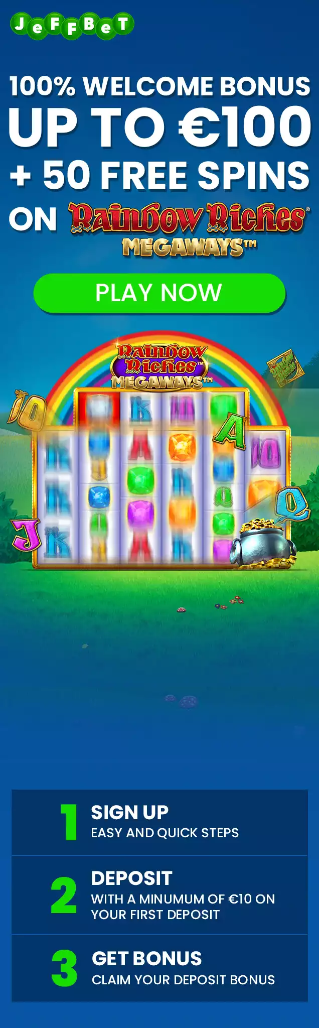 3. Get 100% Up To 100 + 50 Free Spins on Rainbow Riches on your 1st deposit – 35x wagering required, when you deposit with a minimum of €10