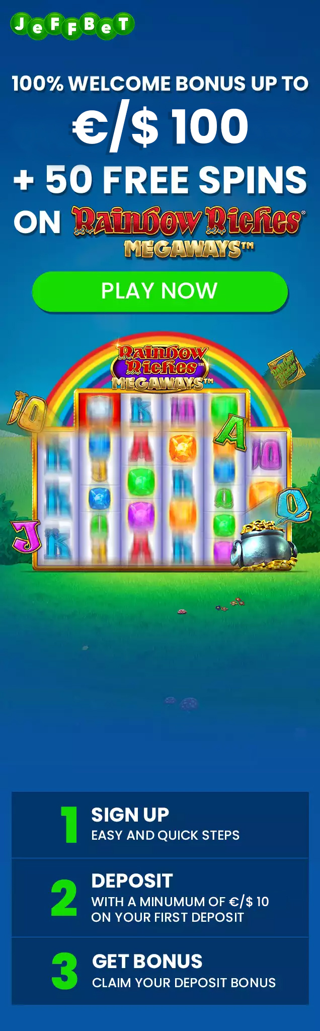 5. Get 100 Bonus & 50 Free Spins On Rainbow Riches Megaways on your 1st deposit – 35x wagering required, when you deposit with a minimum of €/$10