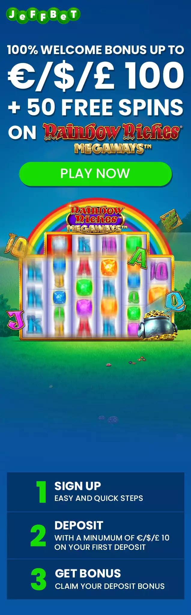 5. Get 100 Bonus & 50 Free Spins On Rainbow Riches Megaways on your 1st deposit – 35x wagering required, when you deposit with a minimum of €/$/£ 10